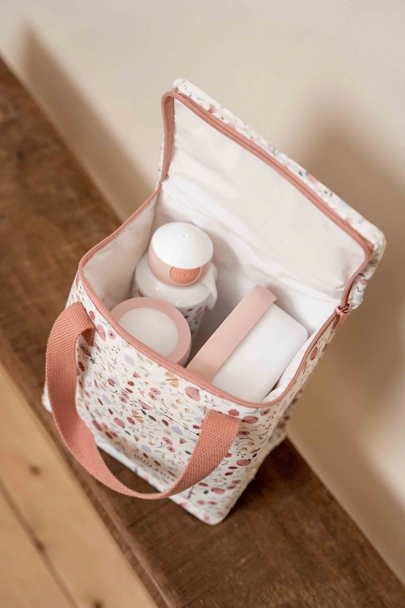 Dit leuke koeltasje met Flowers & Butterflies print is gemaakt van stevig canvas. De binnenkant is isolerend, waardoor hapjes en drankjes lekker koel blijven. Ideaal voor een lunch op school én voor onderweg! De koeltas is 21,5 x 20 x 12 cm. Genoeg ruimte voor een lunchbox, stuk fruit en een flesje of pakje drinken dus. In het vakje aan de voorkant kan je nog een koekje kwijt en met de hengsels neemt je kindje de koeltas gemakkelijk mee.